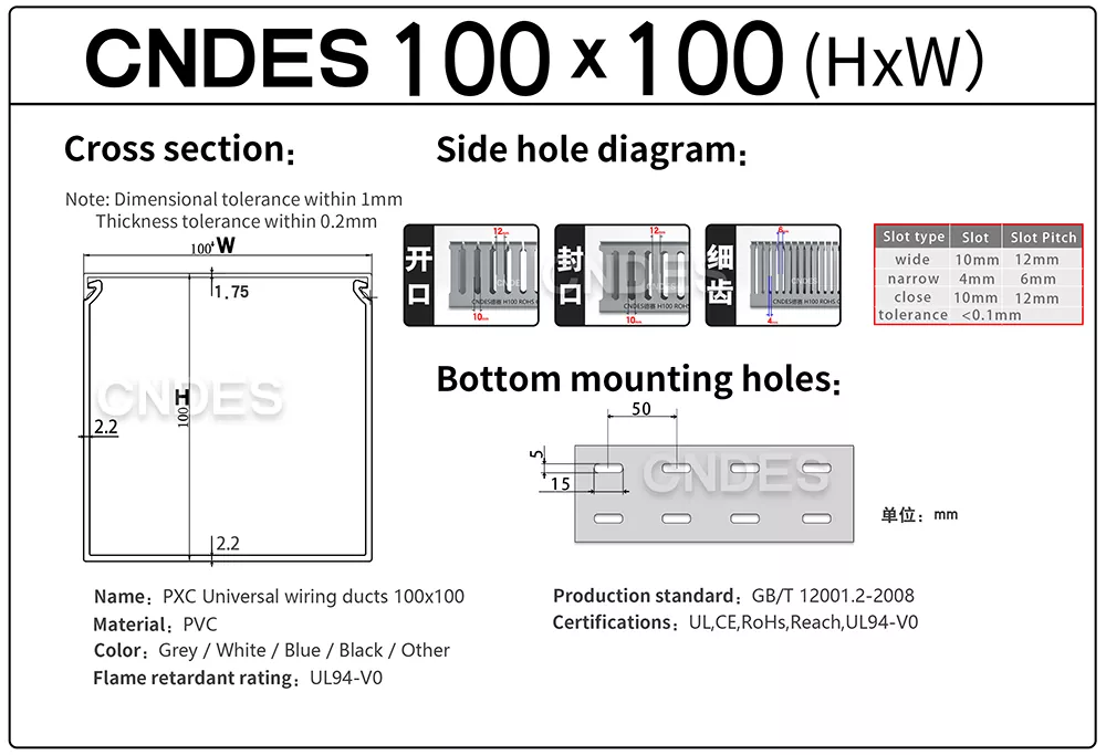 قم بتحسين مشاريع الكابلات الخاصة بك من خلال قنوات كابلات إدارة الأسلاك المخصصة مقاس 100 × 100. باعتبارها شركة رائدة في تصنيع وتوريد حوامل الكابلات PVC في الصين، توفر CNDES حلولاً موثوقة وعالية الدقة وقابلة للتخصيص لجميع احتياجات إدارة الكابلات الخاصة بك. لدينا جميع مواصفات مجاري الأسلاك (حوامل الكابلات). إذا كنت بحاجة إلى مواصفات أخرى، فلا تتردد في الاتصال بنا!