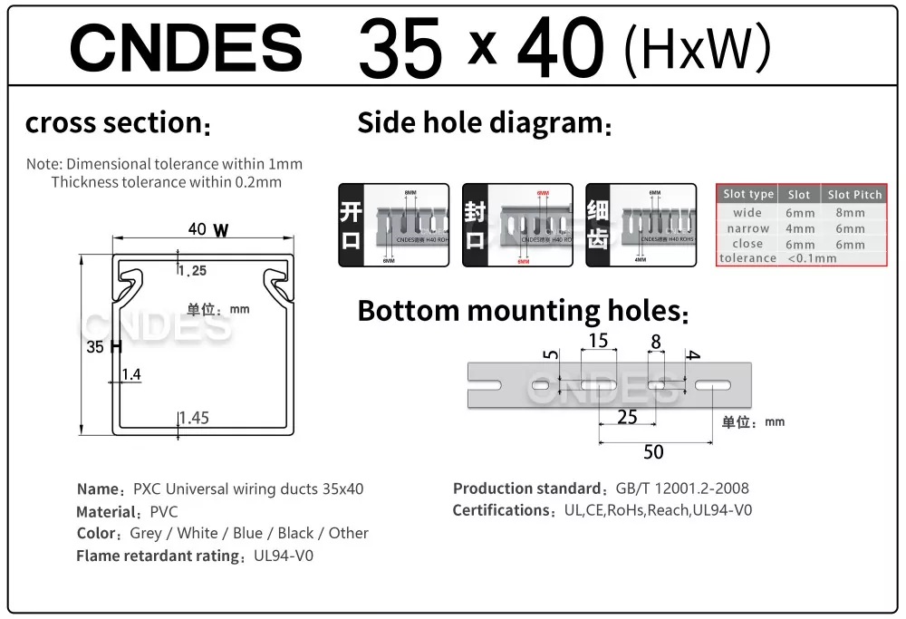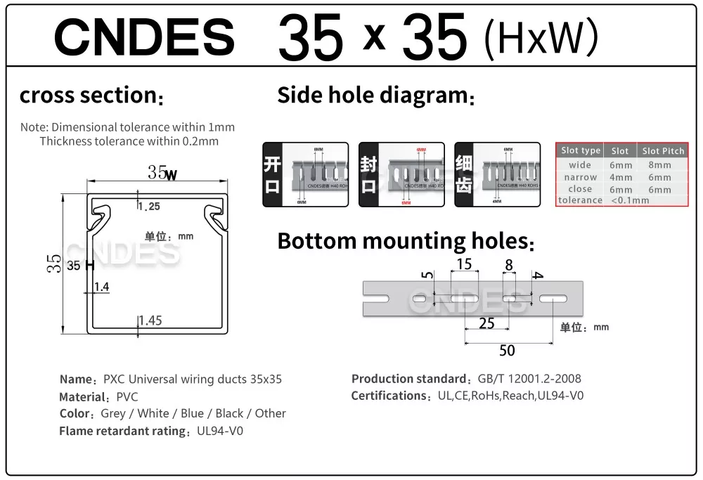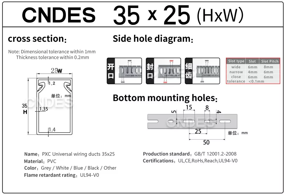 الشهادات الدولية: تم اعتماد قناة توجيه الأسلاك البلاستيكية المخصصة ذات الارتفاع 35 مم لتلبية أعلى معايير السلامة، بما في ذلك UL وCE وRoHS وREACH.