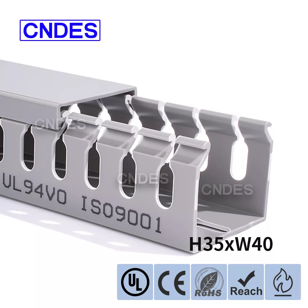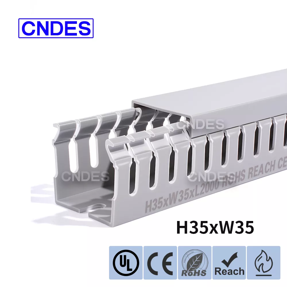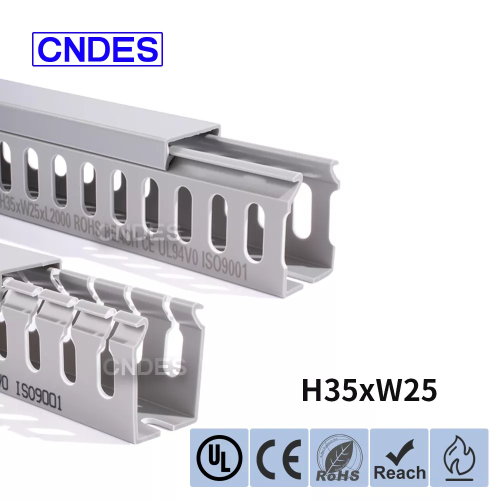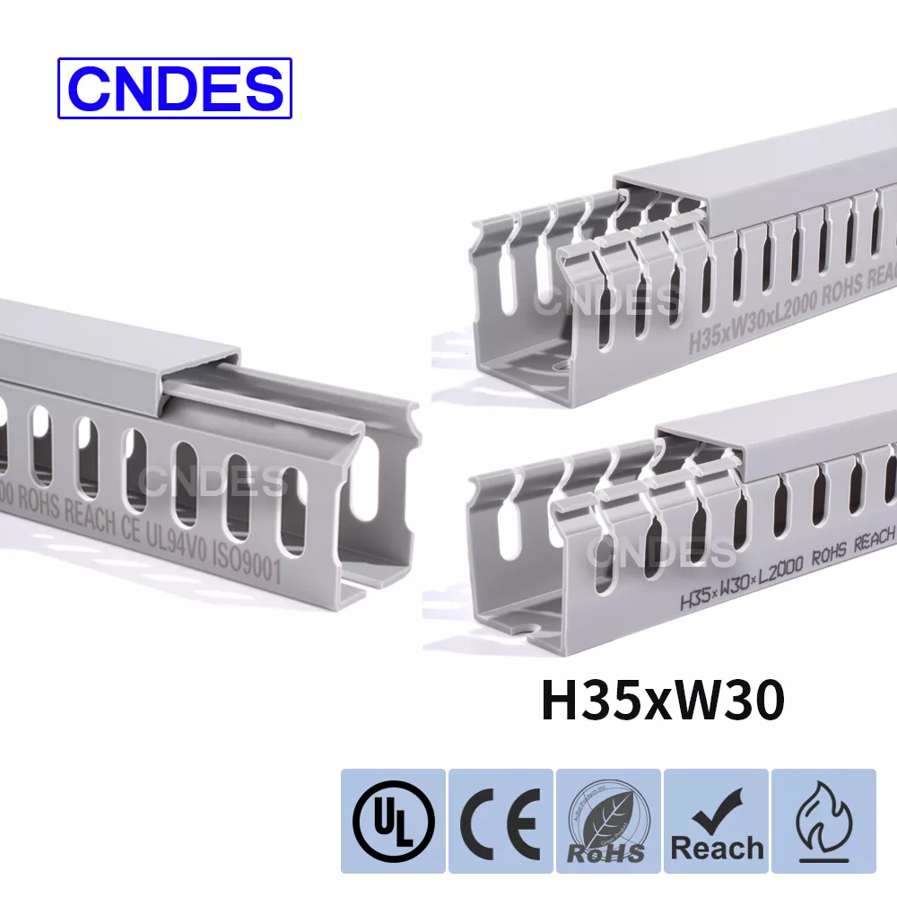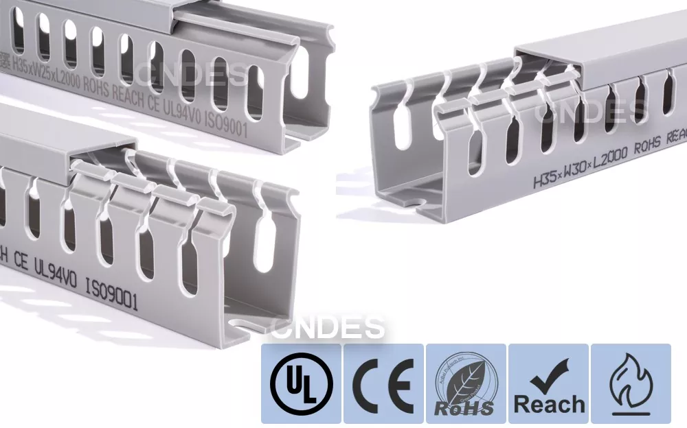 تتكون قناة توجيه الأسلاك البلاستيكية المخصصة بارتفاع 35 مم والمصنوعة من قبل شركة CNDES الصينية من قاعدة PVC صلبة وغطاء قابل للإزالة. تتميز القاعدة بأخاديد متساوية البعد تشبه الأصابع ومختومة على كلا الجانبين، وتشكل "أسنان المشط". يمكن كسر هذه الأسنان باليد، مما يسمح للسلك بالخروج أفقيًا من أي موضع. يتم تثبيت الغطاء بسهولة مرة أخرى في مكانه، مما يحافظ على مظهر أنيق. يتوافق صف من فتحات التثبيت في الأسفل مع التباعد القياسي DIN 43659. يمكن تثبيته بسرعة على الألواح أو إطارات الخزانات أو الهياكل المماثلة باستخدام مسامير أو مسامير M5.