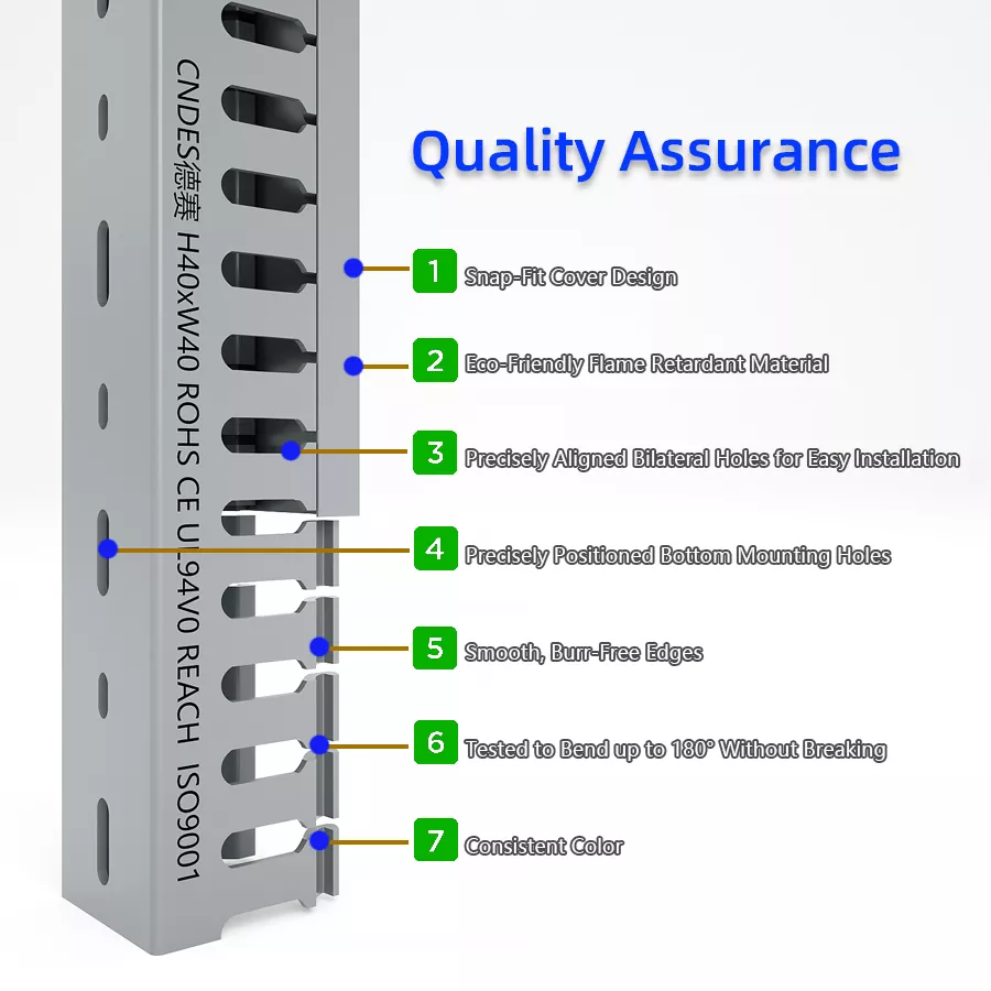 CNDES هو مصنع ومورد موثوق لحوامل الكابلات PVC في الصين. نحن نضمن جودة المنتج المستقرة، والتباعد الدقيق بين الفتحات، والامتثال لمعايير UL، وCE، وRoHS، وREACH، المناسبة للمشاريع محليًا ودوليًا.